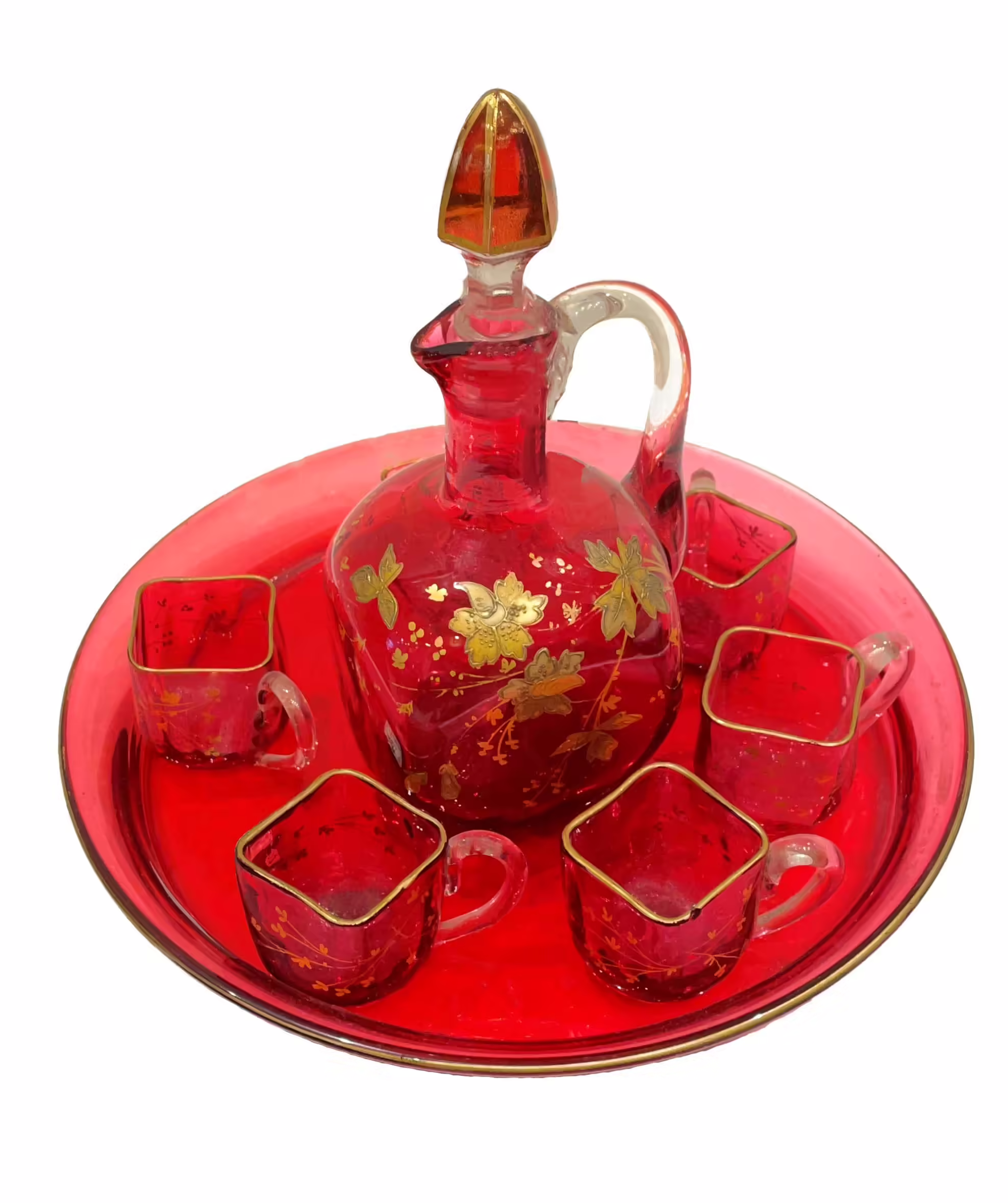 Boheme Red set handcrafted high class glass, round tray, 6 cups, 1 jug around 1930