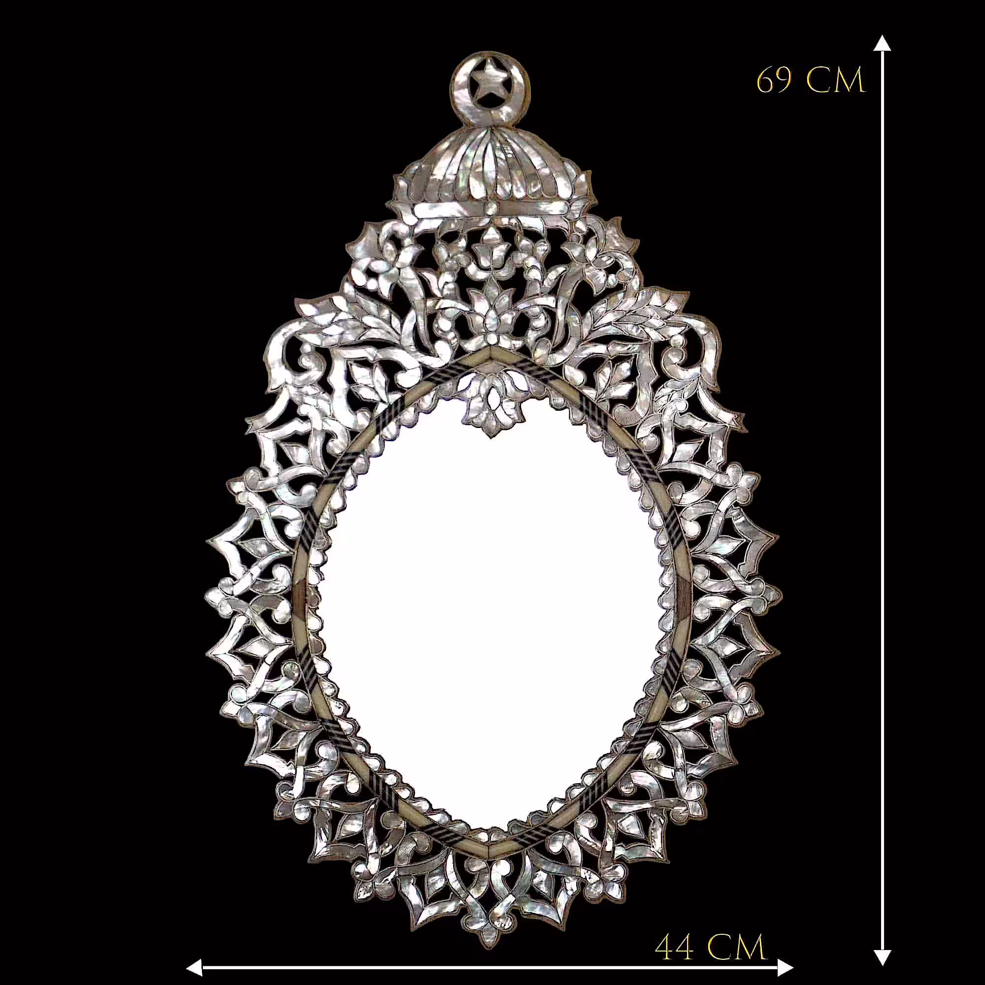 Experience the beauty of this handcrafted mirror, fully inlaid with shimmering freshwater mother-of-pearl. Each mirror is a masterpiece of art, created by a skilled team of Syrian craftsmen and taking a full week to complete. The mother-of-pearl is expertly carved into a unique design that sets it apart from other mirrors.