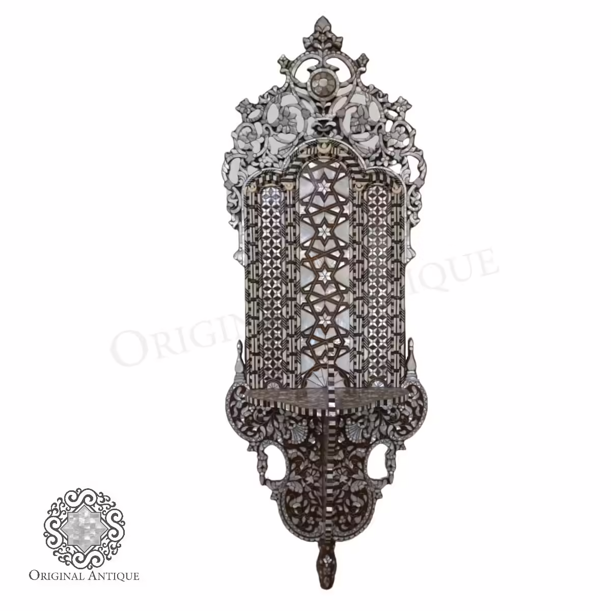 Elevate your home decor with our stunning Handcrafted Walnut Wood Wall Shelves, featuring breathtaking mother-of-pearl inlays and intricate damask-style artwork. Each shelf is a unique work of art, handcrafted from natural Walnut wood with careful attention to detail. The beautiful design of these shelves brings a touch of beauty and sophistication to any room in your home.