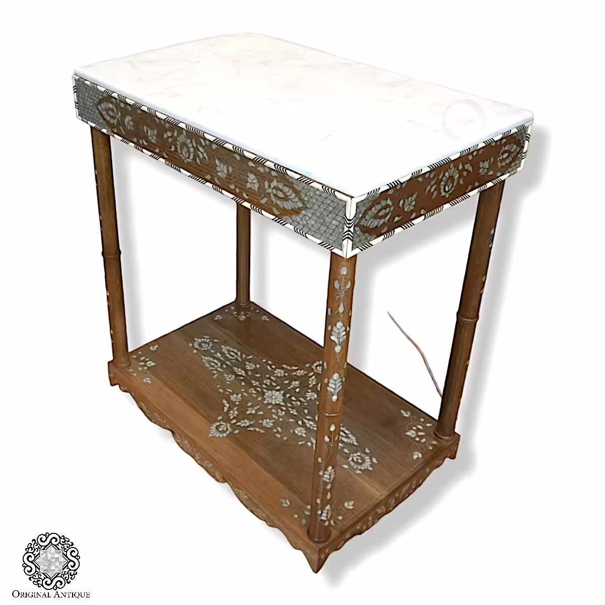 Be the first to review “Hand-Crafted Serving Wooden Table Featuring Mother of Pearl Inlay and Marble Top.” Cancel reply